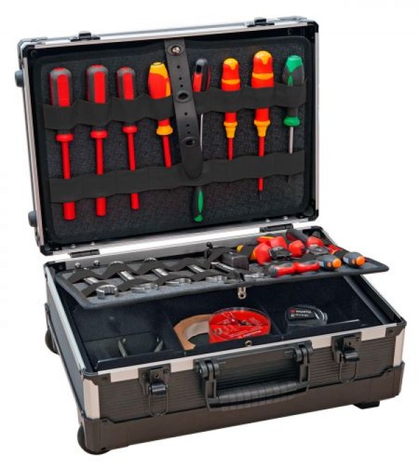 Trolley porta utensili con pareti in ABS stampate ad iniezione e robusti profili in alluminio di rinforzo. Grande resistenza e ottimo rapporto qualità/prezzo. 2 pannelli porta utensili con elastici. Tasca porta documenti con tasche porta utensili. Maniglia ergonomica con grip in gomma. Due serrature con chiave. Due cerniere di sicurezza. Superficie interna facilmente lavabile